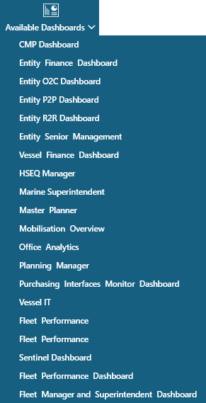 The current Dashboards available to users are as listed below, however, depending on the user's profile only the dashboard assigned will be available