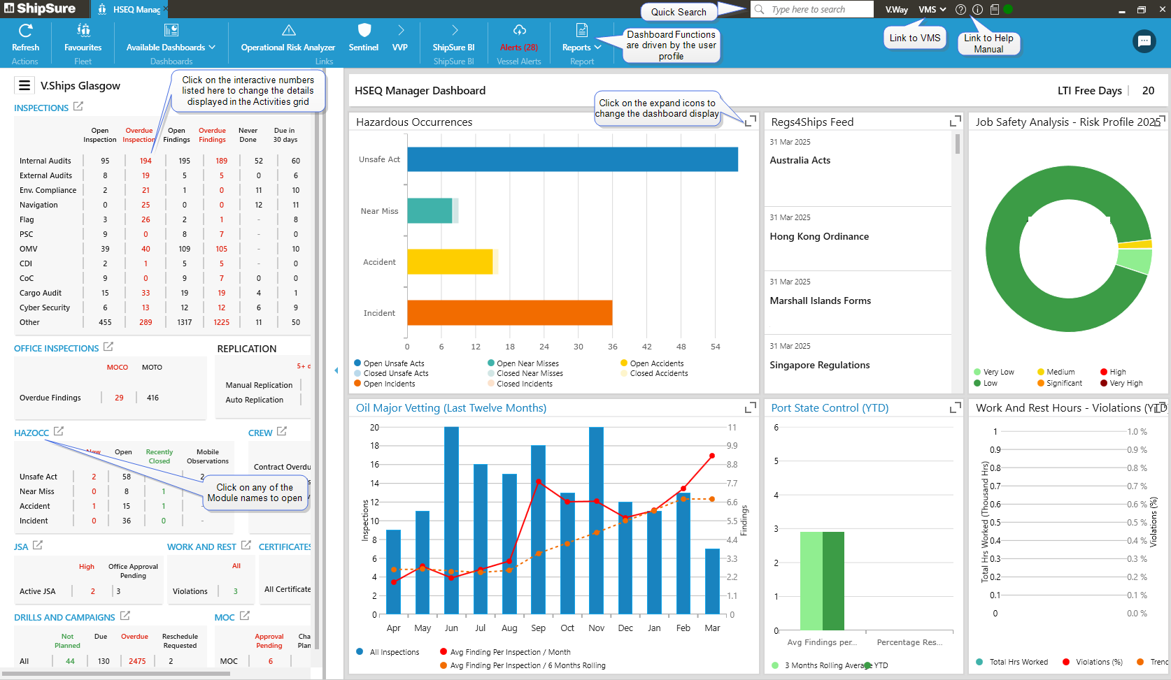 When the user logs into the ShipSure application the Dashboard will display the most important information that they will require to deal with in Real Time