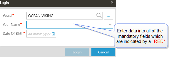 Crew members will login by entering the Vessel Name, their own name and date of birth