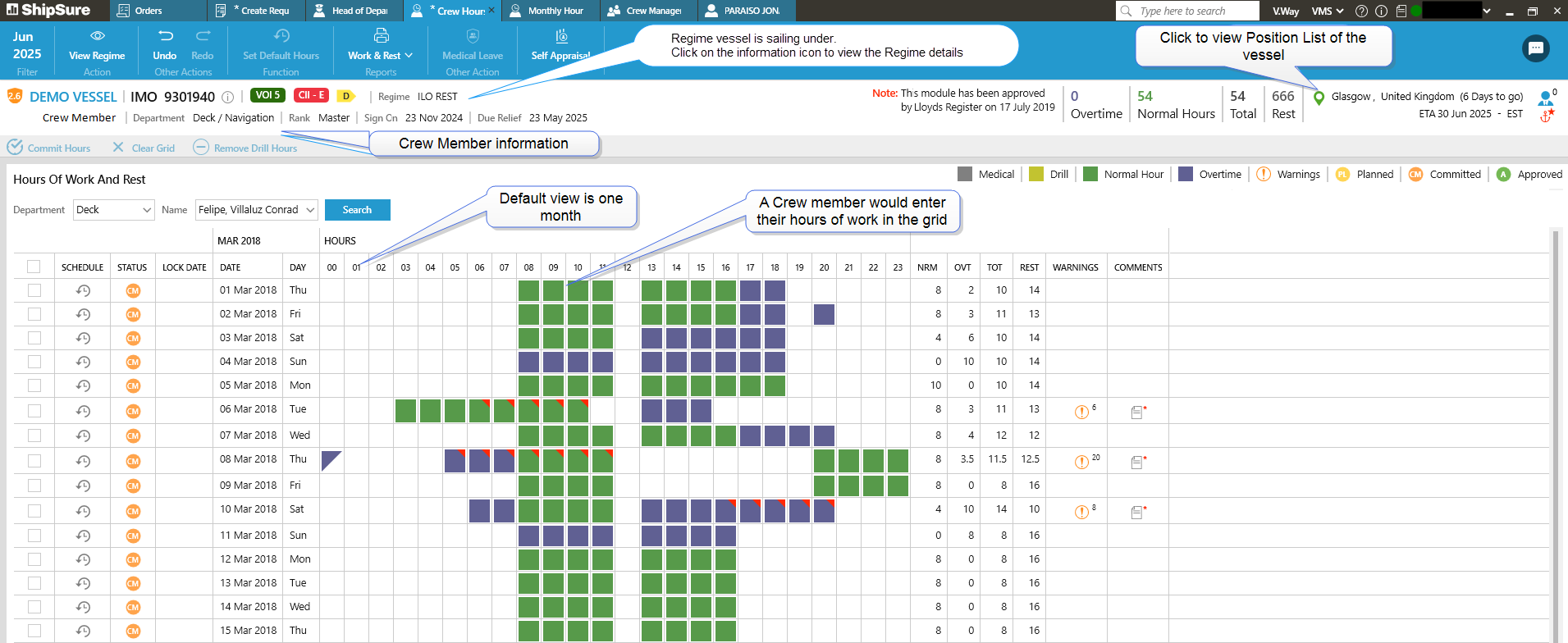 Within ShipSure - the Work and Rest Module enables the user to perform operational and technical functions involved in vessel operations