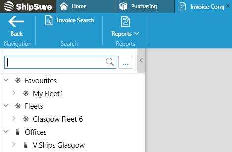 Using either option to open the Comparator, now select a vessel by either entering the vessel name or selecting a vessel from the Favourites, Fleets or Office tree.