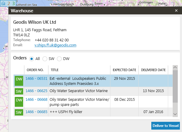 With the warehouses option turned on, view all the warehouses that have orders for the selected vessel (these are split into SW and DW). Clicking on the order number opens its details.
