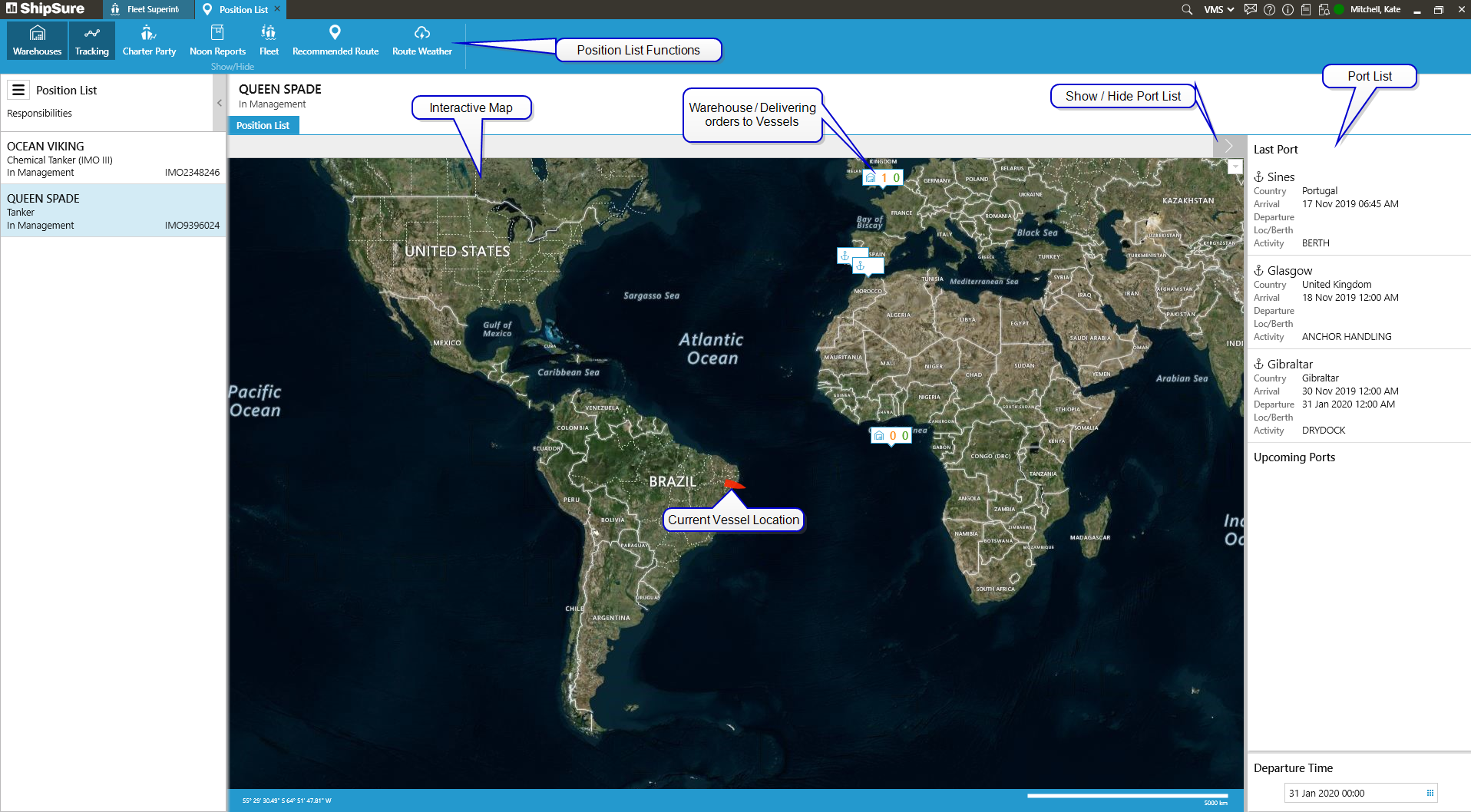 The Position List gives a view of the current and planned destinations for vessels and any agents registered near the destination ports via use of an interactive map. Direct access to the Position list can also assist user with setting up the delivering of orders.