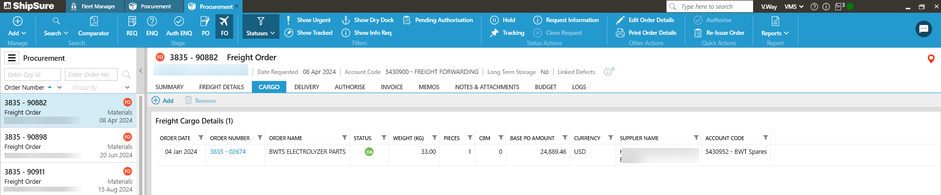 - Only orders for the selected vessel that are stored at the same warehouse (status code: SW) will be available for selection.