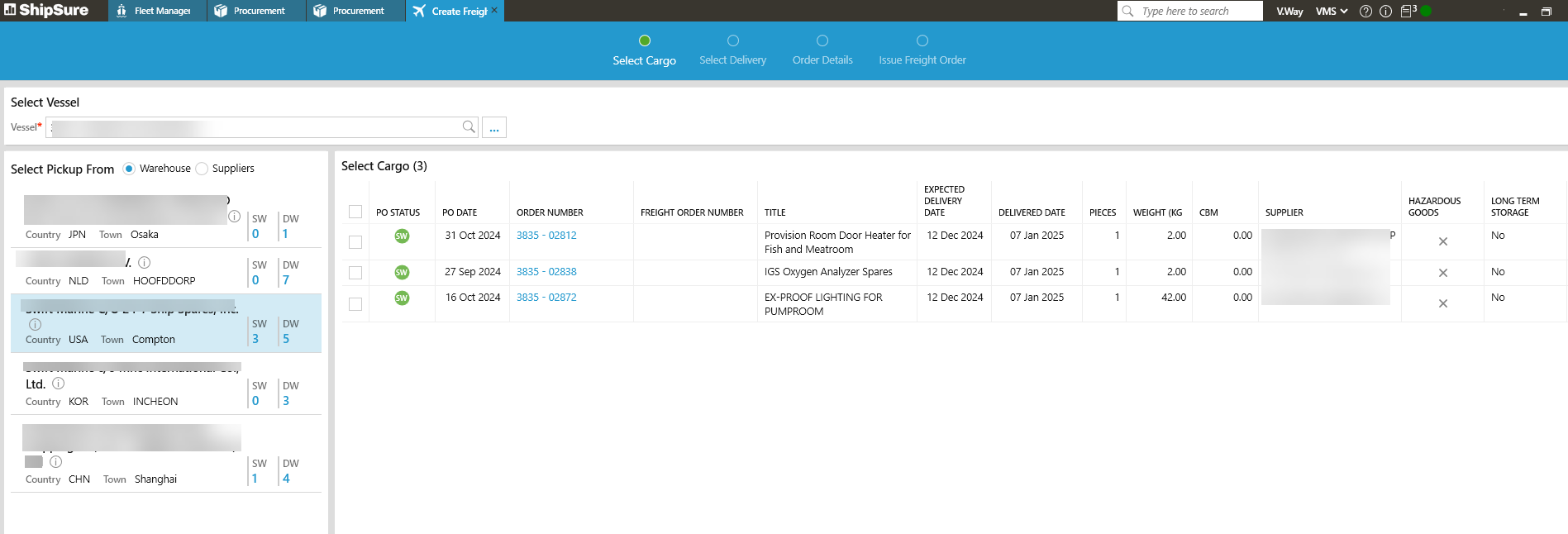 - A list of warehouses which have orders for the vessel will be displayed. The number of orders with the status SW and DW at each warehouse is also displayed.