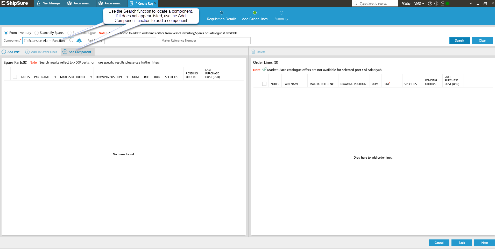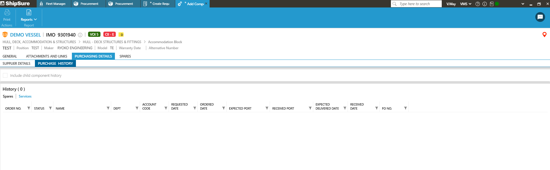 Click [ShipSure], then [Marine Purchasing], then [Orders]. This will open the Requisition Details Wizard where a new requisition can be added. Generating a Requisition using this method will not automatically insert a vessel name.