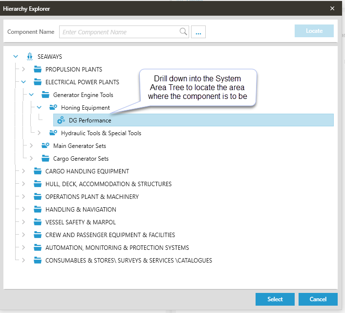 This will open the System Area Tree for the vessel the requisition is being created for where the user can drill down into the area where the Component is to be added.
