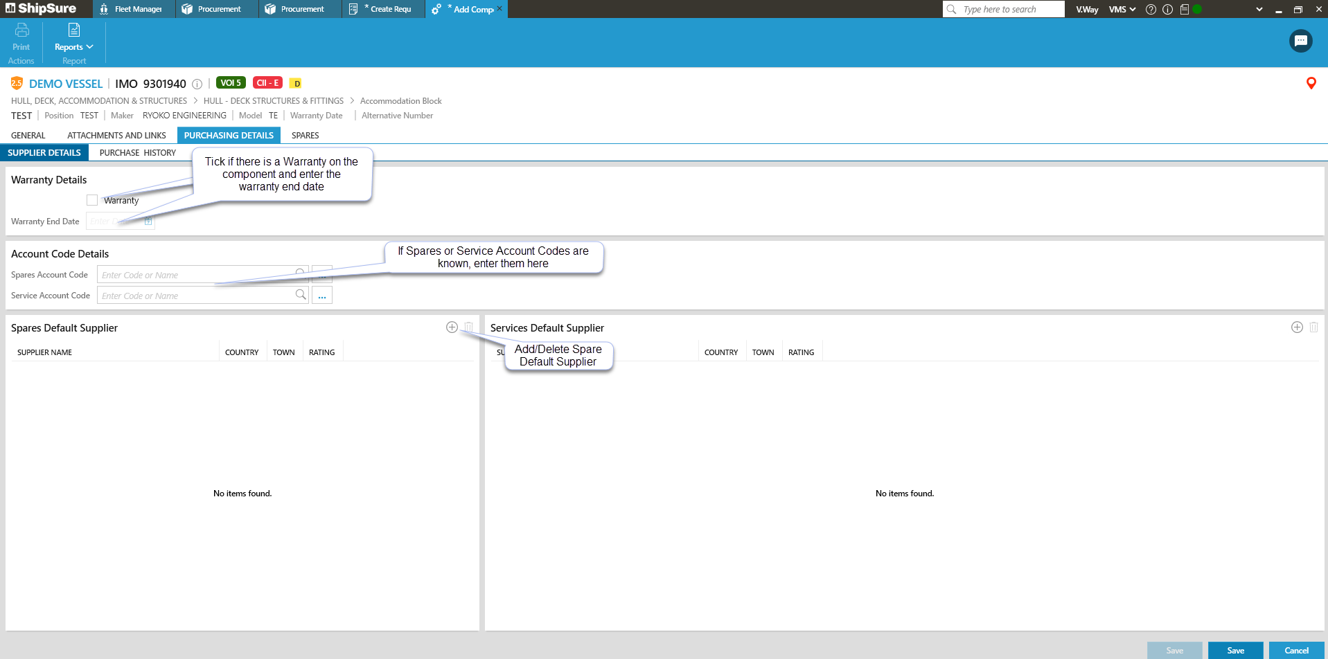 If account codes or suppliers for spares and services are known, enter the details.