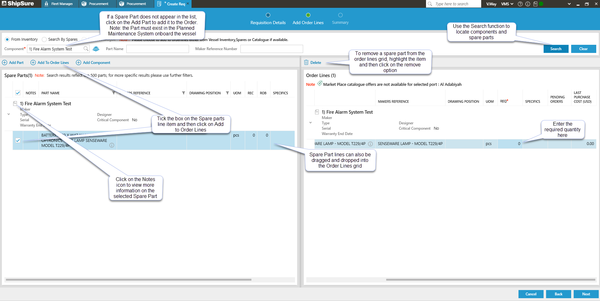 Click [Add to Order Lines] or Drag and Drop the selected spare parts to the order lines grid.