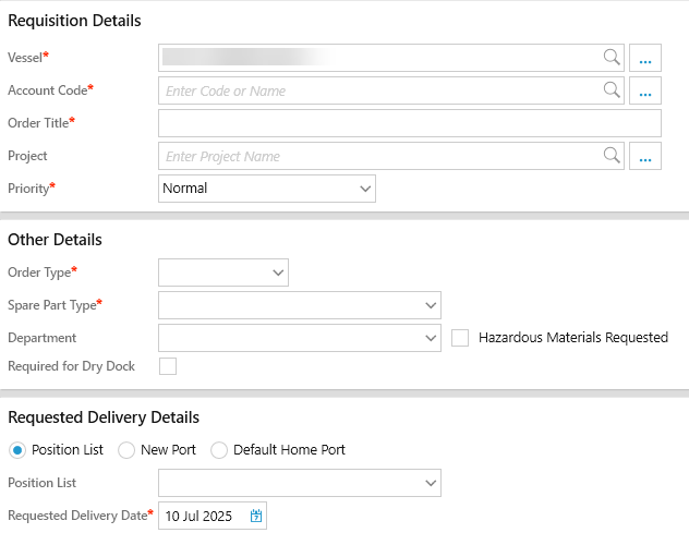 Click [Add], then [Requisition]. If an order has been selected in the order list, its vessel name will automatically be added to the new requisition but the vessel name can be changed if required.
