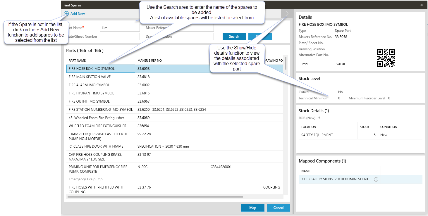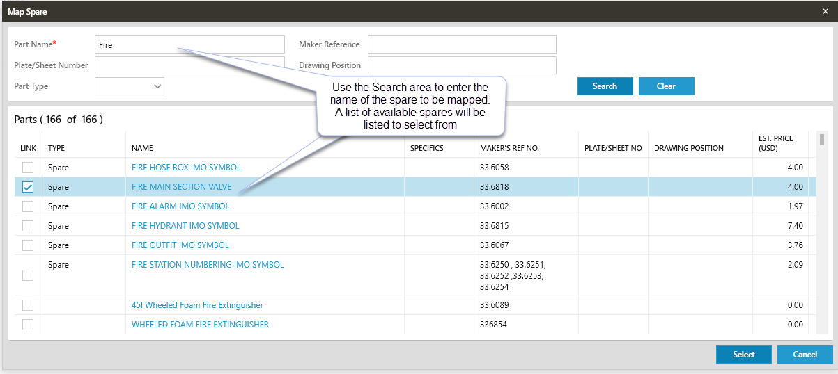- Type the spare part name or Makers reference number into the appropriate field.