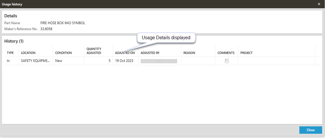 The Usage History grid will open to display any previous usage for the selected part.