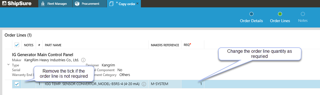 - The order quantities can be changed by editing the numbers in the REQ column. Untick the box beside any line item that is not to be included in the order.