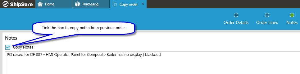 - From within the Purchasing tab, select an order from the list on the left, then click the Copy Order button at the top of the screen.
