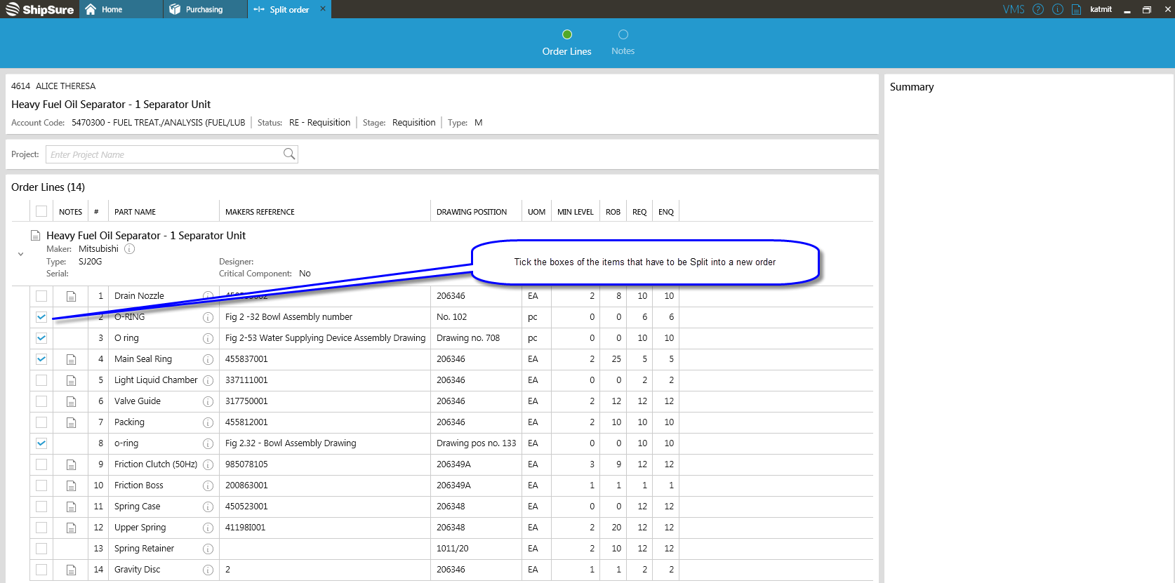 - Open the requisition / enquiry you want to split, then click the [Split Order] button at the top of the screen.