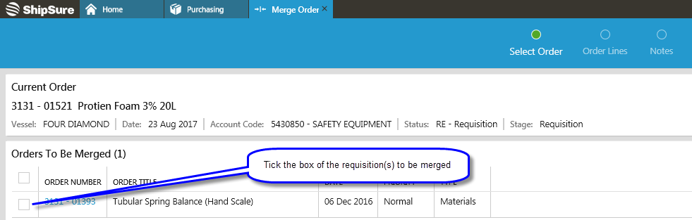 - If the requisition can be merged, ALL the orders will be displayed, select the requisition to be merged then click [Next]