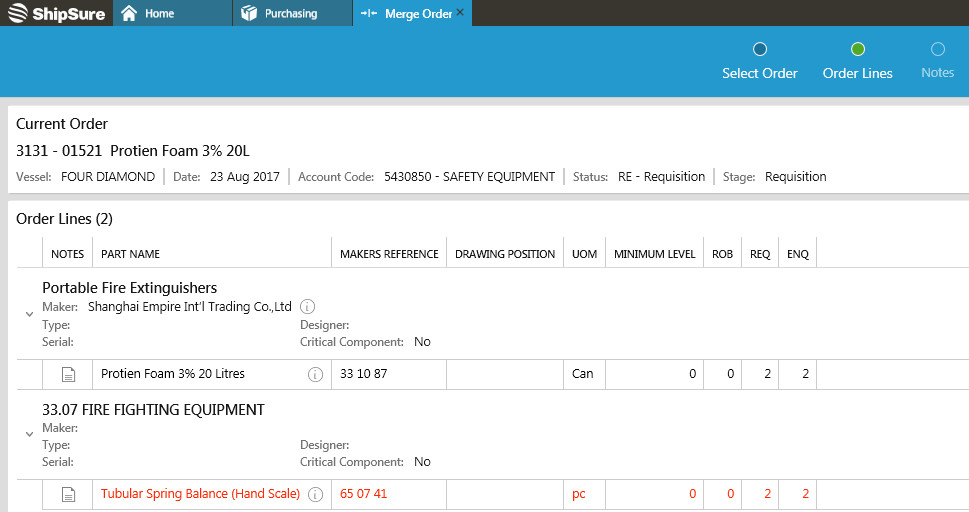 - Click [Finish] to complete the process and the merged requisition will be displayed. The other requisition(s) will no longer exist in ShipSure.