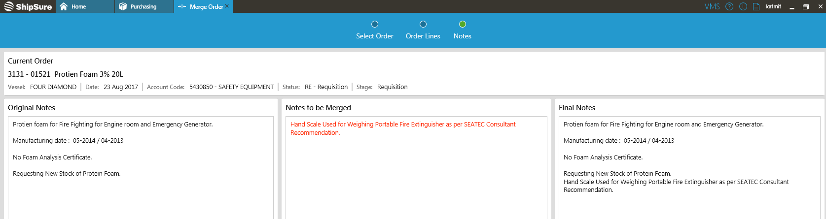 - On the final page, the notes from the original requisition and the requisition(s) to be merged can be viewed. These are collated in the "Final Notes" field, although they can be edited if required.