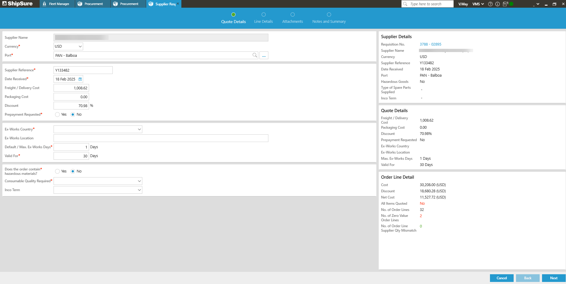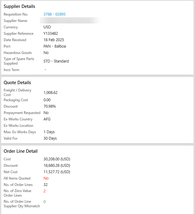 Throughout the "Supplier Quote" process, the summary section on the right of the screen will display key information about the supplier, quote and order lines.