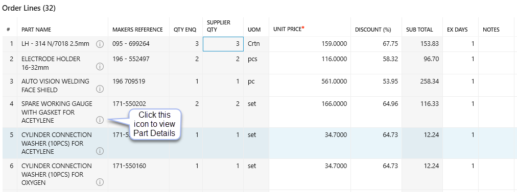 - On the [Next] page, the quantity, unit price, discount, ex-days (also called lead days) or notes for any line in the order can be edited if required.