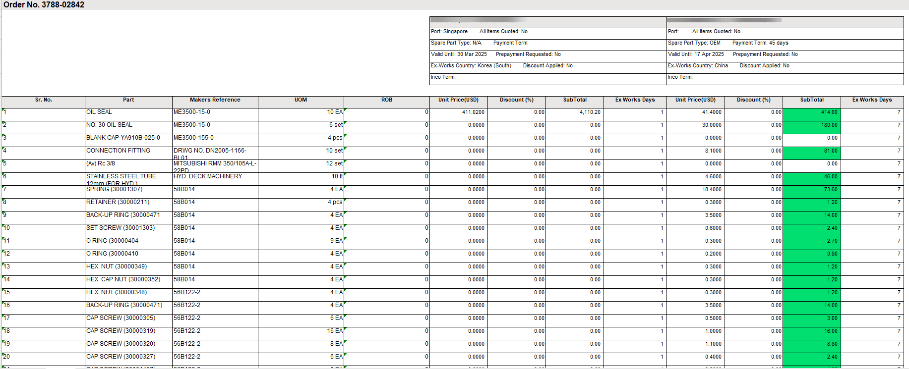 - For each supplier, its port, spare part type, how long the quote is valid and ex-works country can be viewed. Click the