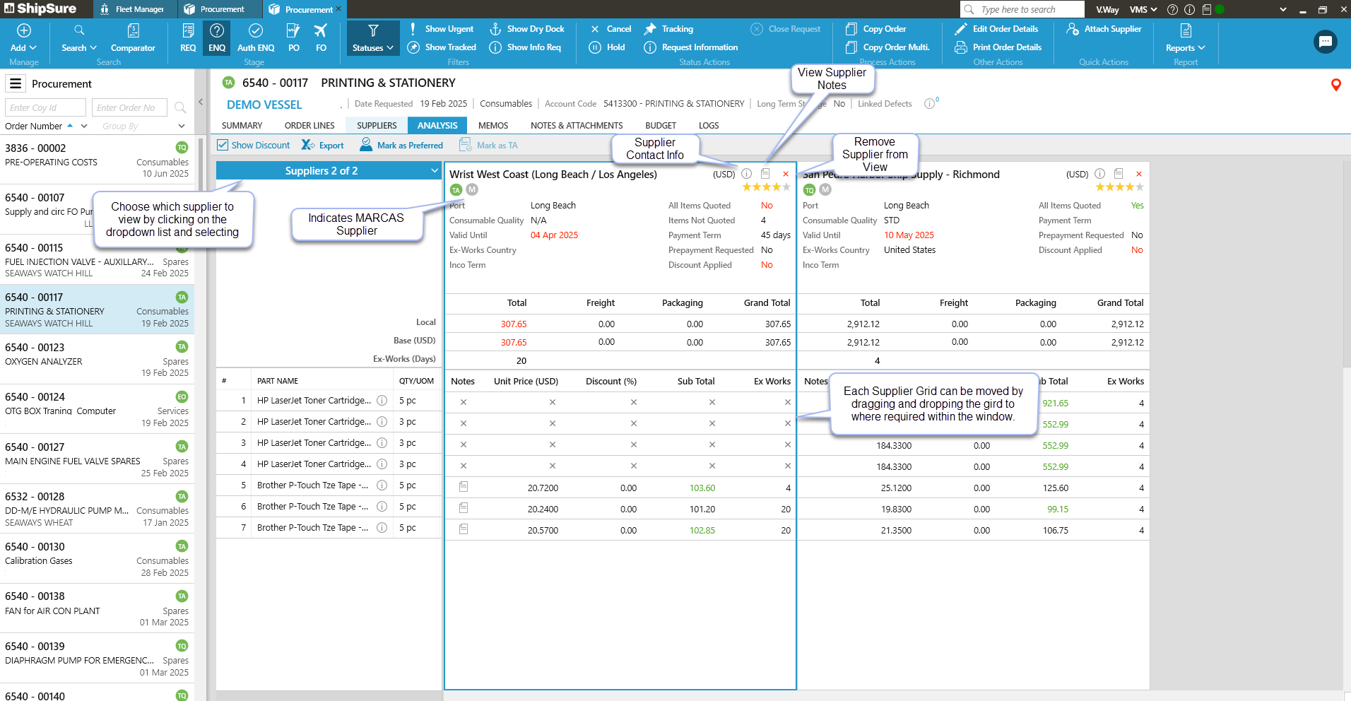 The Quote Analysis makes it very simple to view multiple supplier quotes simultaneously, helping identify the best supplier for the order.