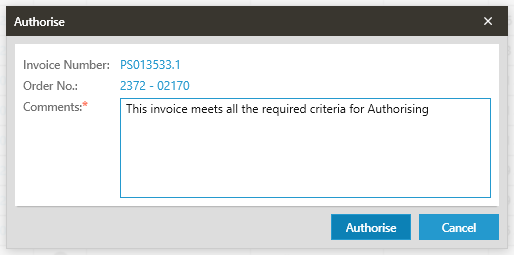 Click on the Authorise Icon, the Authorise Comments window will open where the reason / comments for Authorising the invoice must be entered