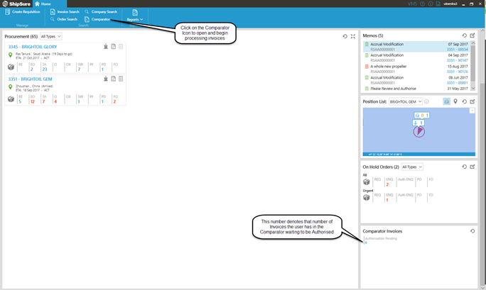 On the dashboard there is a Comparator Invoices widget and by clicking on the number (if there is one) this will open the comparator and display the vessels assigned to the user who's invoices are to be processed.