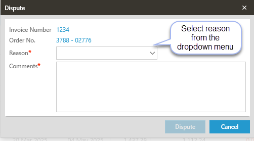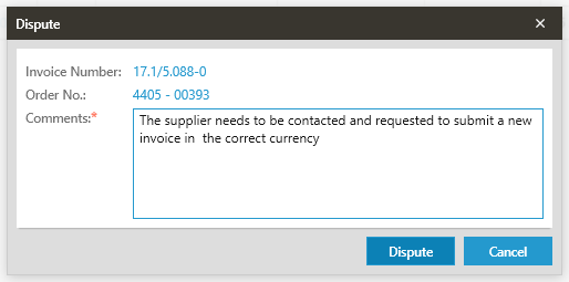 Click on the Dispute Icon, the Dispute Comments window will open where the reason / comments for Disputing the invoice must be entered