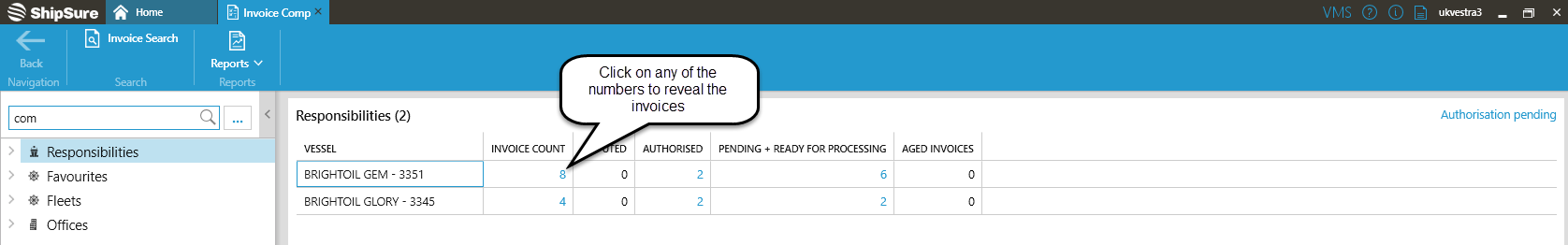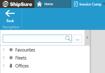 Then select the vessel who's invoices are to be viewed either by typing the name of the vessel into the search box or selecting it from the Favourites, Fleet or Offices options