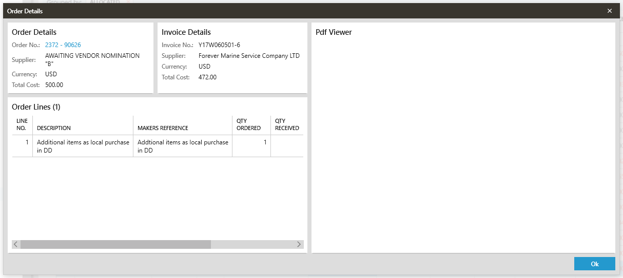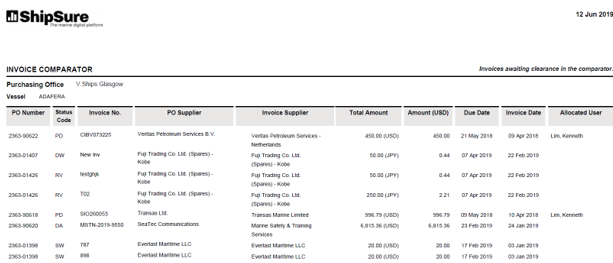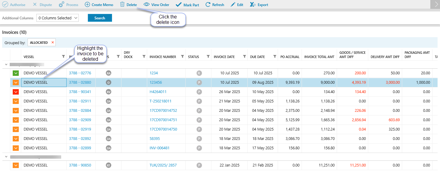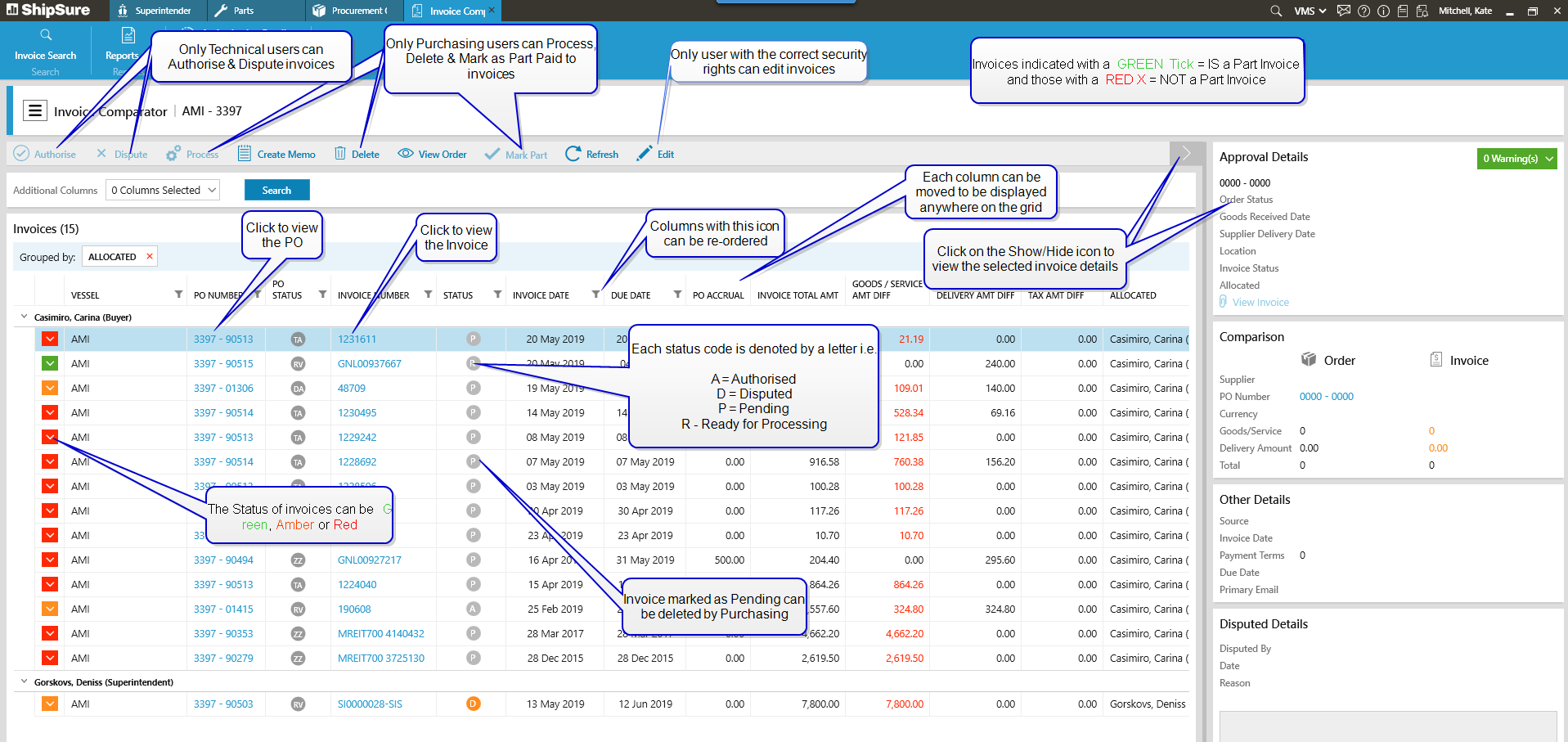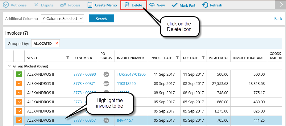 After a vessel has been selected the invoices allocated to the Buyer and Supt. will appear in a grid, where they can be (depending on job role) Authorised, Processed, Deleted, Disputed, Marked as Part Paid and Viewed.