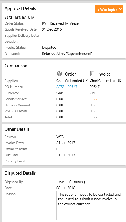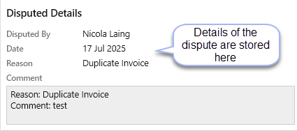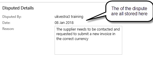 The reason for the Dispute can then be viewed by all users in the Disputed Details grid when the invoice line is selected