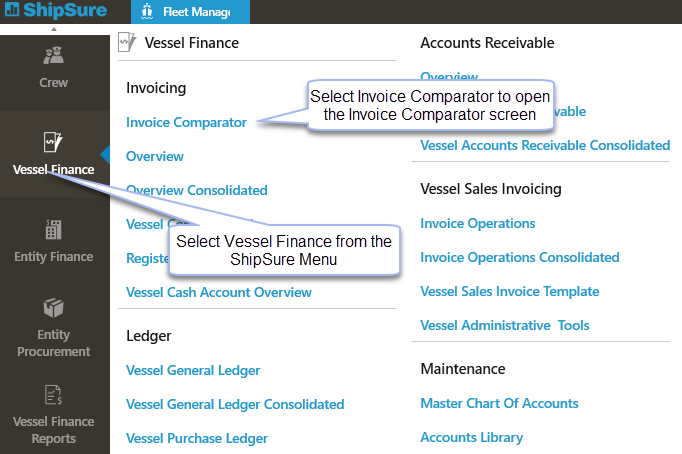 Another way is to click on the ShipSure Icon then select Vessel Finance then Invoice Comparator: