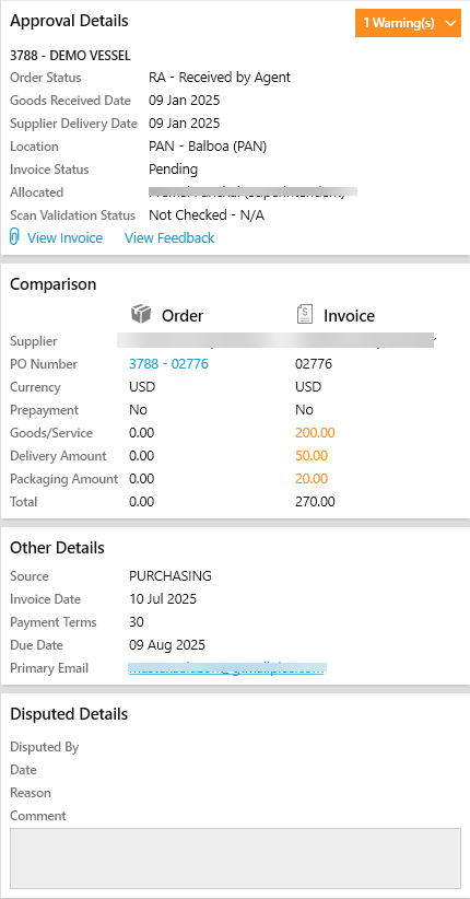 The Summary view on the comparator grid displays any Warnings, Approval details, Invoice and Order Comparison, Other details and Disputed details for a selected invoice.