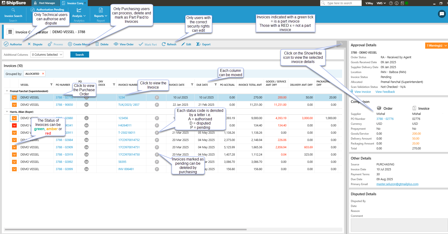Only the Supt. or Fleet Manager can Authorise & Dispute invoices.