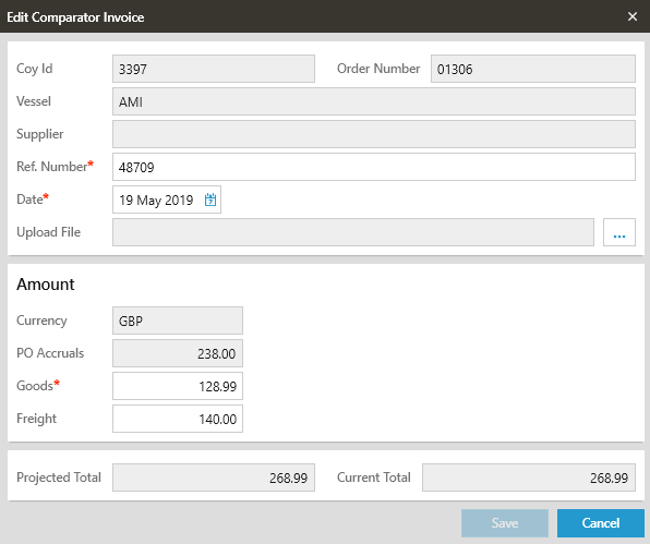 The Edit Comparator Invoice grid will open and allow the user to update the required details