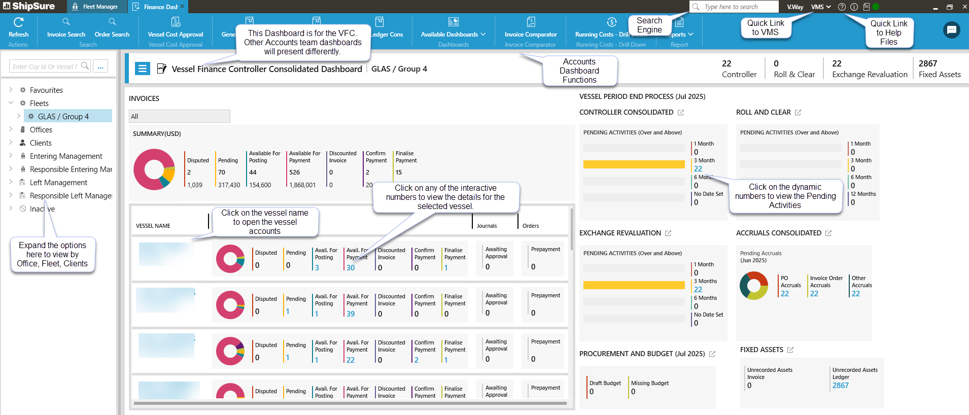 The Accounts Dashboards can be populated to be viewed by Individual vessels or by a Fleet of vessels
