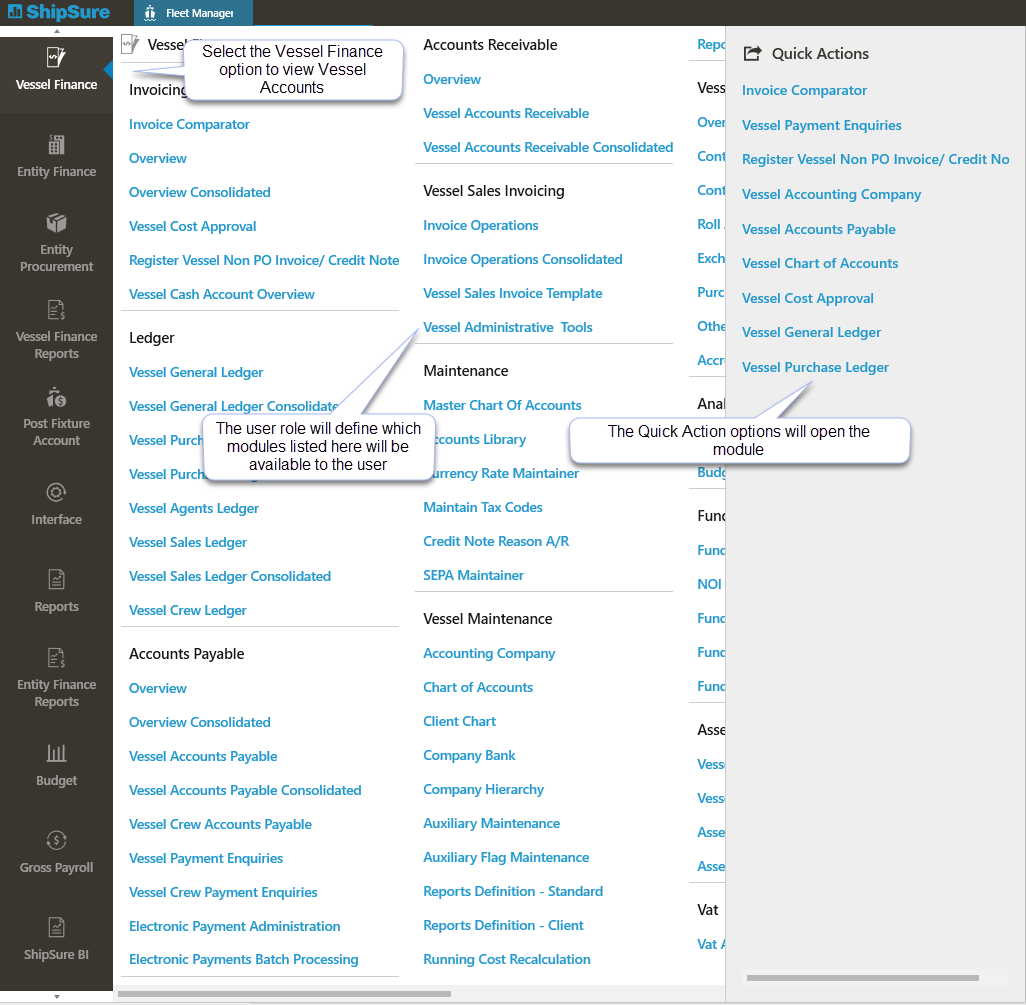 Below is a list of the various modules that can be accessed within the Vessel Finance applications.